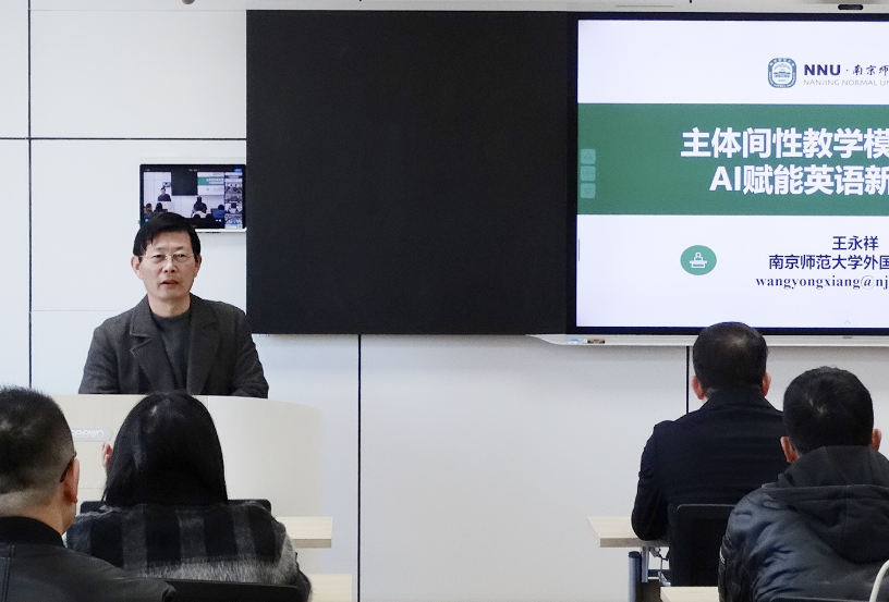 11月29日,南京师范大学beat365在线唯一官网登录院长王永祥教授莅临beat365指导,主讲了一场以“主体间性教学模式视域下AI赋能英语新质课堂”为主题的学术讲座,深入探讨了AI技术在英语新质课堂中的应用,勉励教师不断提升自己的数字素养和技术应用能力,更好地适应AI赋能的教学环境。