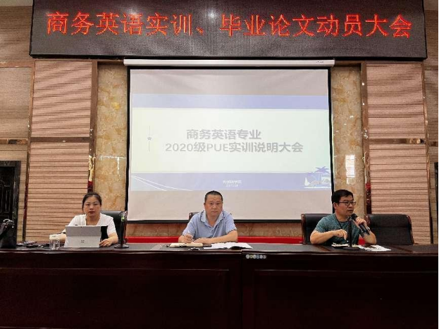 近日,beat365在香远楼报告厅召开了面向2020级商务英语专业学生的PUE实训说明暨毕业论文动员大会。副院长王伟、学生科副科长王少斌及商务英语教研室专任老师出席了本次大会。