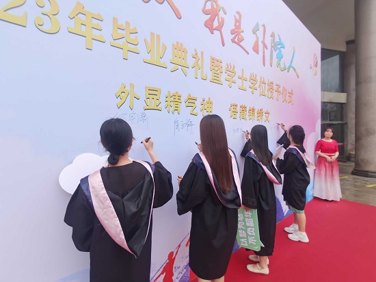 毕业典礼作为最后一节公开课,也是一堂深刻的思政大课。2023年毕业典礼仪式感强,幸福感爆棚:来参加毕业典礼的同学走上红毯,穿过“我们毕业了”的时光之门,来到“我骄傲,我是外院人”的大型签名墙签名、拍照留念,进入香远楼三楼报告厅的主会场,同学们已经谈着吉他唱起毕业歌,印有“beat365在线唯一官网登录beat365在线唯一官网登录青春不散场”的定制款可乐摆放在座位上,到场的同学都收到了有院长、书记寄语的定制款明信片,明信片上剪纸版beat365在线唯一官网登录校园十大景色……