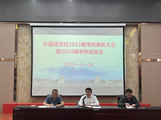 院长周志高指出,此次考研表彰大会暨考研动员大会引导和鼓励学生立志考研深造,是提高学院人才培养质量的有力抓手,是促进学院学风的有效举措。他指出:在准备考研的过程中,需要做到以下几点:第一,要有明确的目标,明确的目标是前进的动力。第二,要制定好学习计划,确定暂时的目标和长久的规划,行百里者半九十,越到最后越要坚持。第三,要了解考研最新消息,掌握第一手资料,做到知己知彼,方能百战不殆。第四,要找到适合自己的学习方法,而不是盲目的照搬照抄。第五,要有毅力,而毅力是胜利的保证,每天强化基础的听说读写专业训练,不断提高专业能力水平。第六,要做到心无旁骛,确保自己每天都处在一个积极备考的状态。最后,他祝愿同学们在今后的学习和工作中创造更加辉煌的成绩。