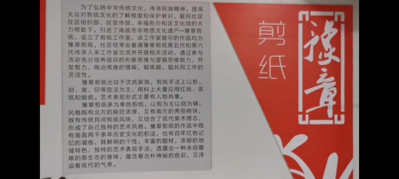 第二站我们来到了南昌市湾里区管理局爱民社区,沈哲曾到南昌市湾里区幸福街办爱民社区,向社区居民传授剪纸技艺。“来来来,大家把红纸对折后,沿对角剪个弧线……”在南昌市湾里区幸福街办爱民社区内,沈老师曾应社区邀请,给社区居民传授剪纸技艺。在沈哲的指导下,居民们将手中的红纸剪成了窗花、喜字,非常有意思。南昌市文化局等单位非常支持“豫章剪纸”艺术的传承,积极牵线搭桥扶持“豫章剪纸”艺术的发展。沈哲也常常利用业余时间,给社区居民和青少年传授剪纸技艺。