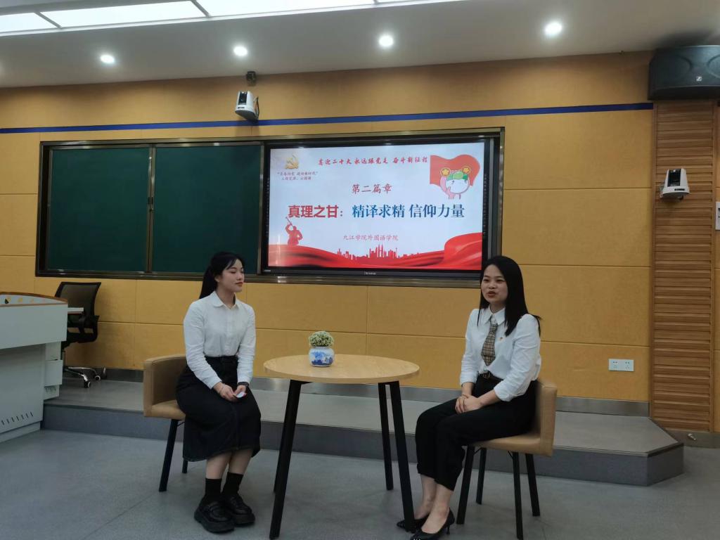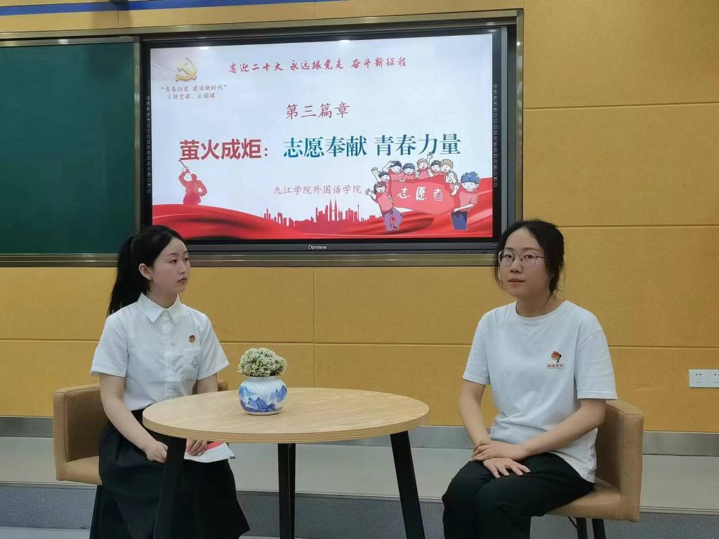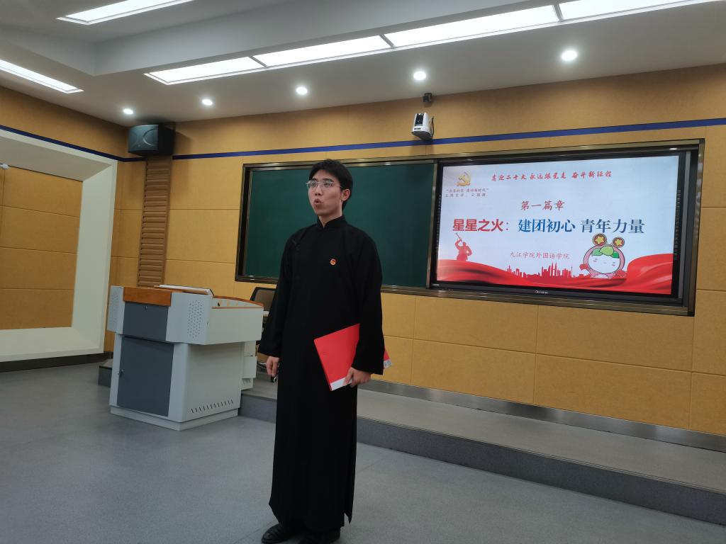 在采访环节,四名不同战线的青年典型和大学生面对面,致力乡村振兴的团干部江山讲述了江西早期党团组织创始人赵醒侬唤醒民众的党史故事,李慧慧老师通过陈望道翻译《共产党宣言》的故事阐述了真理之甘,青年志愿者孔启惠分享了用担当构建起疫情防控青春防线的青春故事,濂溪区团委书记徐星介绍了九江打造青年发展型城市的情况,勉励大学生在加快“六个江西”建设中勇担开路先锋之重任。从百年党史故事,到个体青春磨砺,四位青年用觉醒、燃烧、弄潮、追梦的心路历程,回答了时代之问,唱响了青春之歌。