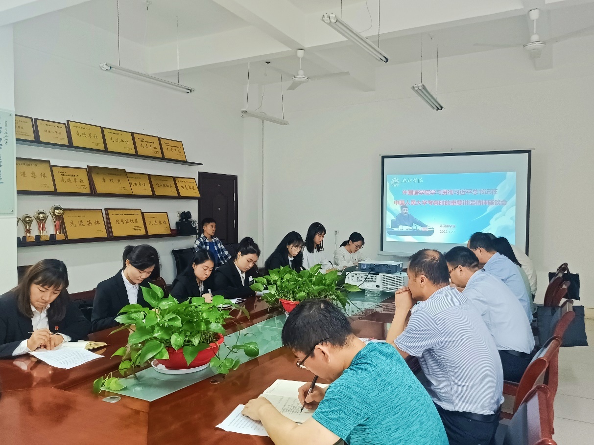 党委书记闫来英在听取师生代表发言后,对学工战线、青年战线落实习近平总书记重要讲话精神作了部署,他要求始终把牢迎接和学习宣传贯彻党的二十大这条主线,进一步校准工作方向、明晰着力重点、突出自身优势、发挥更大作用,不断加强和改进思想政治工作。尤其要抓好五个方面的重点工作。一要扎实开展好“喜迎二十大,永远跟党走,奋进新征程”的主题教育实践活动,抓住建团百年有利契机,宣传好贯彻好习近平总书记对新时代青年和青年工作的期望要求;二是要持续深化党史学习教育常态化、长效化;三是要不断创新思想引领的方式、方法;四是要着力优化和提升学院的共青团工作;五是要结合外语专业特色,进一步加强党的建设。