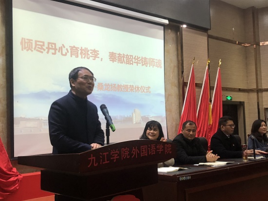 周志高代表学院感谢桑龙扬教授为学院教育事业的发展作出的重要贡献。他指出,荣休对教师来说,是对过去教学生涯的总结和肯定,承载着事业发展的成就和荣光,学院举办荣休仪式,就是想增强“外院人”的归属感、荣誉感,让“竞知向学、厚德笃行”的九院精神不断传承和弘扬。桑教授在学院奋斗了38年,见证了学院的发展成就,学院每一份成就和进步都凝聚着他的智慧与汗水,希望桑教授退休后继续关心支持学院的发展,发挥好余热,为学院的发展继续贡献力量。
