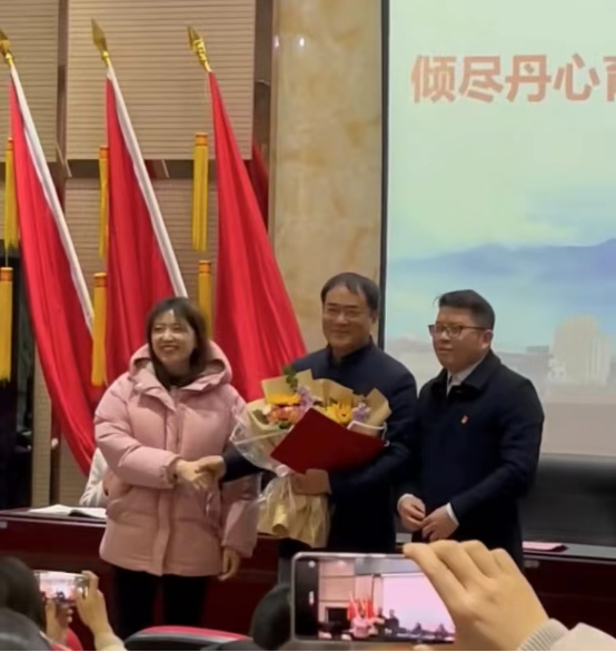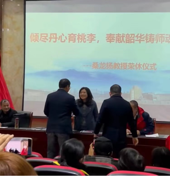在优美深情的歌声中,院长周志高为桑教授颁发了荣休证书,翻译教研室主任赵宋文送上鲜花并合影留念。亲切的握手、热情的拥抱、真诚的问候传递着学院对桑教授的感激之心和祝福之意,全场以热烈的掌声向桑教授致以最诚挚的敬意和祝福。
