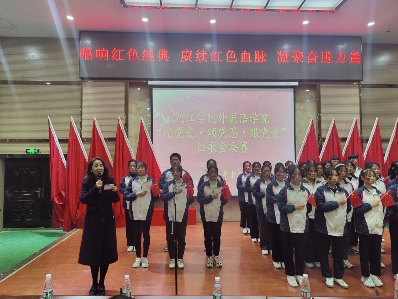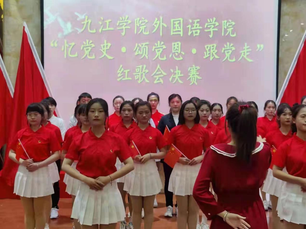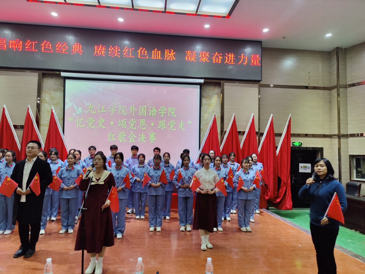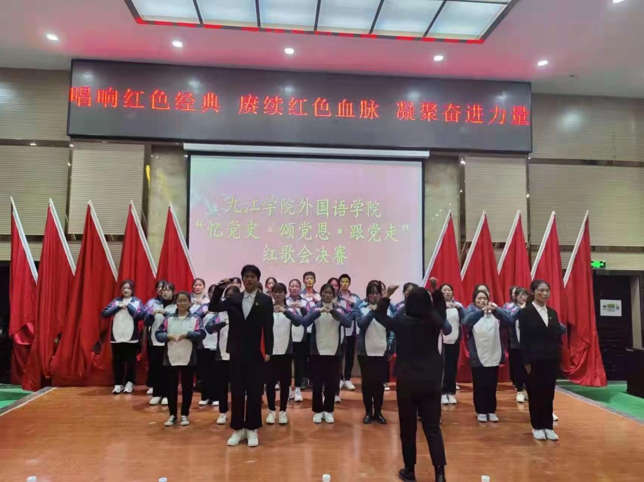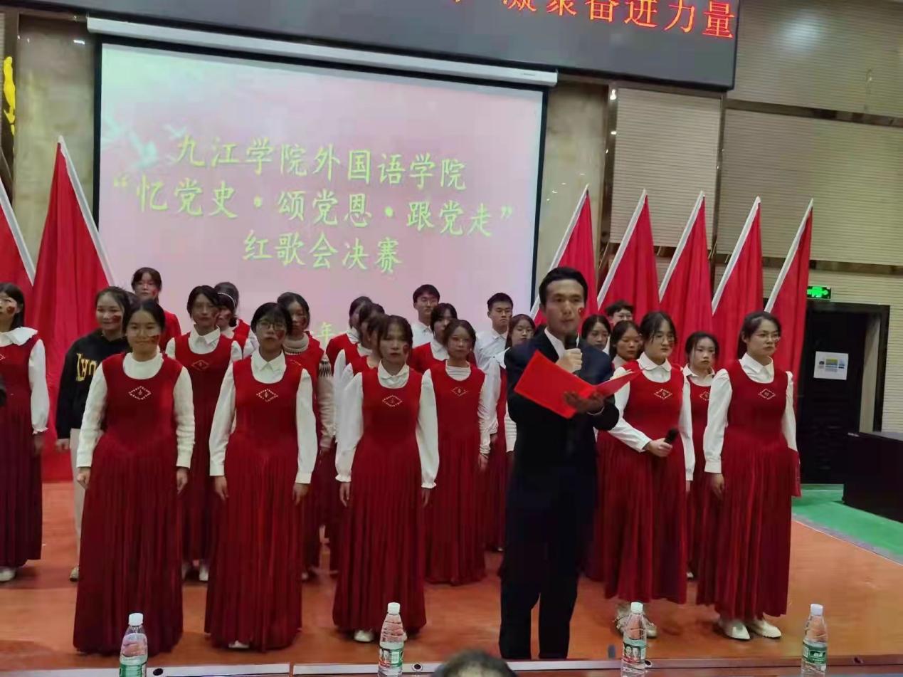 决赛阶段,班级按抽签顺序依次表演。参赛队员衣着统一,斗志昂扬,舞台环节丰富多样,有领唱、有歌伴舞、有歌伴朗诵等,通过各种形式展示着外院学子的爱国情怀和班级凝聚力。比赛中,各位班主任老师倾情助力班级的精彩表演。比赛中,项莉老师对外语A2031班同学的“少年灵魂三问”一次一次地鼓舞现场所有少年“担当责任于己身”,万敏、李超、李南云等老师在班级合唱队伍中倾力助演,外语A2033班章妍老师以舞抒情用舞蹈表达对党的热爱。台上师生以饱满的热情深情演绎了《没有共产党就没有新中国》《歌唱祖国》《红旗飘飘》等经典红歌,“少年志,则国志;少年富,则国富;少年强,则国强;少年独立,则国独立”声声赞歌,句句誓言,处处展现着外院师生“忆党史”初心不改,“颂党恩”百折不挠,“跟党走”坚定不移。比赛现场气氛热烈,高潮迭起,赢得了在场观众的热烈掌声和阵阵喝彩。比赛结束后,学生党员合唱团演唱了《我们走在大路上》。