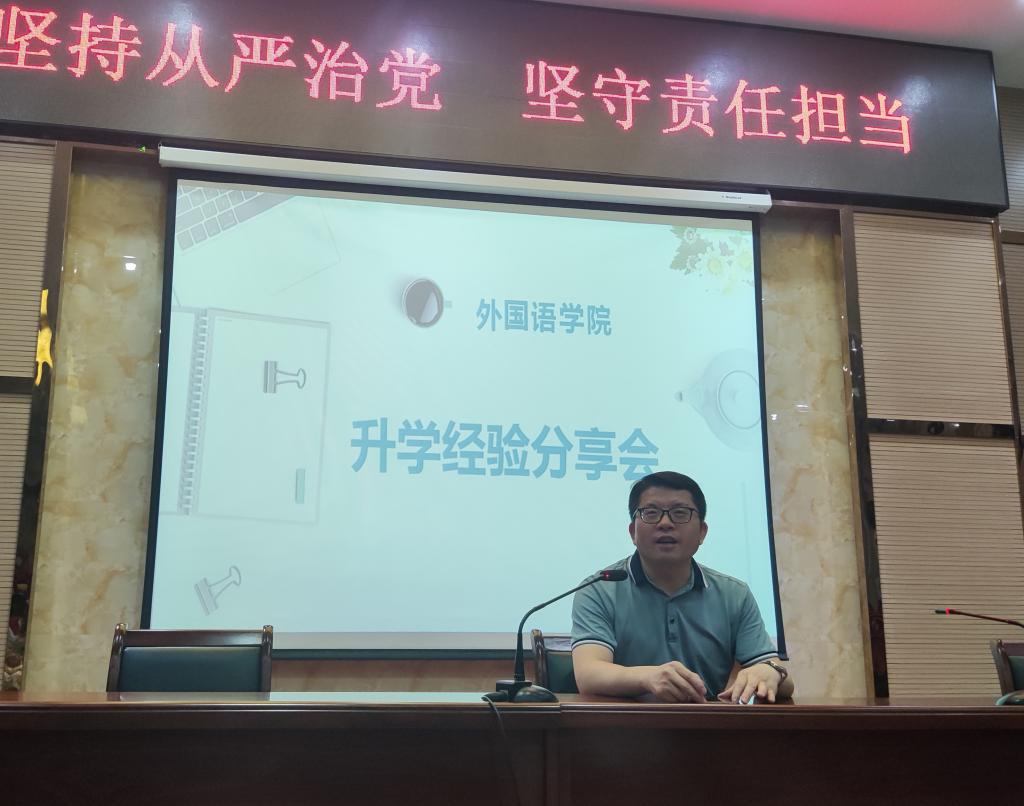 本学院两位名校年轻教师周燕平和郭思霈分别对英语笔译和出国留学进行分享交流。两位老师着重强调了英语备考过程和复习方法,同时详细说明了留学申请的途径及必备条件,这些宝贵的学习经验都有利于同学们的规划和发展。最后周志高院长上台发言,鼓励同学们积极考研,努力认真的追逐梦想,并代表学院各位老师,寄托了对考研同学的期待与信心。