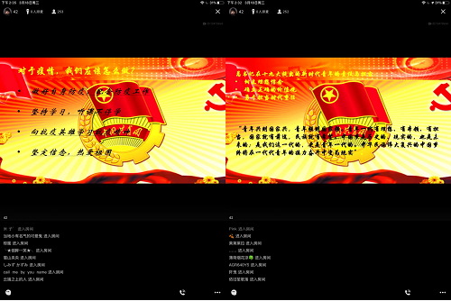 在线上团课上,王旭阳用一个个网络平台上的方舱实拍视频打破了网上的不实传言,诙谐幽默地抨击了外媒的不实报道,让我们看到中国在疫情面前把人民群众生命安全和身体健康放在第一位的实际行动,看到一个敢于担当的大国形象。同时启发我们要不惧谣言,时刻提升自我辨认信息真假和独立思考的能力,做到心中有“数”;余欢庆分享了一个意味深长的视频,通过视频告诉我们,只有全国人民团结一致才能聚起“燎原之火”,我们居家隔离也是为疫情防控贡献了一份力量;知己知彼才保护好自己,病毒我才不怕你,志愿行动从我做起,张捷给我们展示了在疫情狙击战中的科学防疫知识和抗疫小故事,同学们受益匪浅。