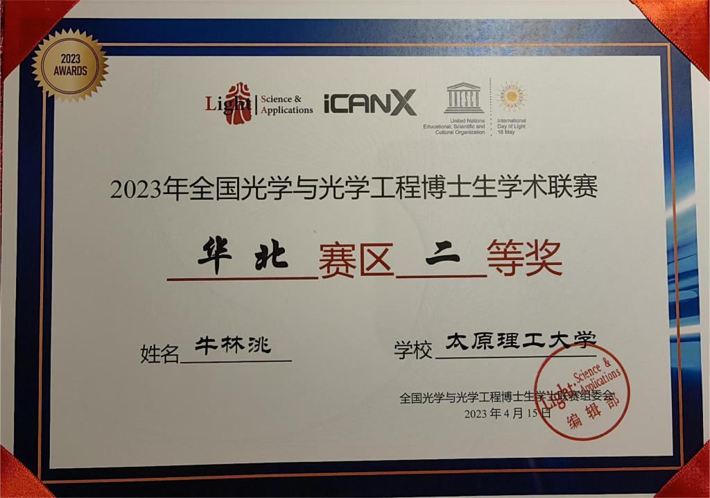 4月14-16日,信誉网赌张明江教授指导的2022级光学工程博士生牛林洮同学在2023年全国光学与光学工程(华北赛区)博士生学术联赛荣获第三名、斩获二等奖。