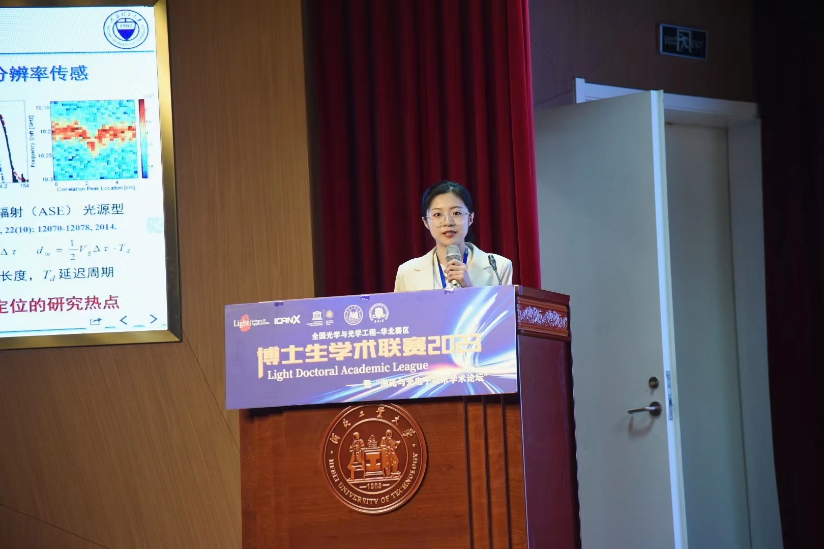 比赛全程采取PPT演示+问答的形式完成。赛会上牛林洮同学作了题为“高空间分辨率混沌布里渊光相关域分析技术”的学术报告,在导师张明江教授、青年教师王亚辉博士的悉心指导下,她准备充分、答辩出色,得到29位评委专家的一致认可,最终获得华北赛区的二等奖(第三名),并将代表华北赛区参加全国百强积分赛。