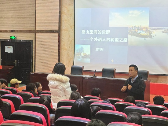 王利刚总经理分享了他的求学和工作经历,为学生学习提供方向指引,同时提醒着大家志存高远也需脚踏实地。其从外企、公务员、国企到自主创业的职业转型轨迹,让他有敏锐独特的眼光去洞察如今跨境电商与商务英语专业的广阔前景,这给予了我们职业规划及未来就业新的启发。他结合亲身经历建议同学们关注行业发展、把握时机,以扎实专业素养与开阔视野立足未来。他专业严谨而又幽默风趣的演讲,赢得了全场观众的掌声。