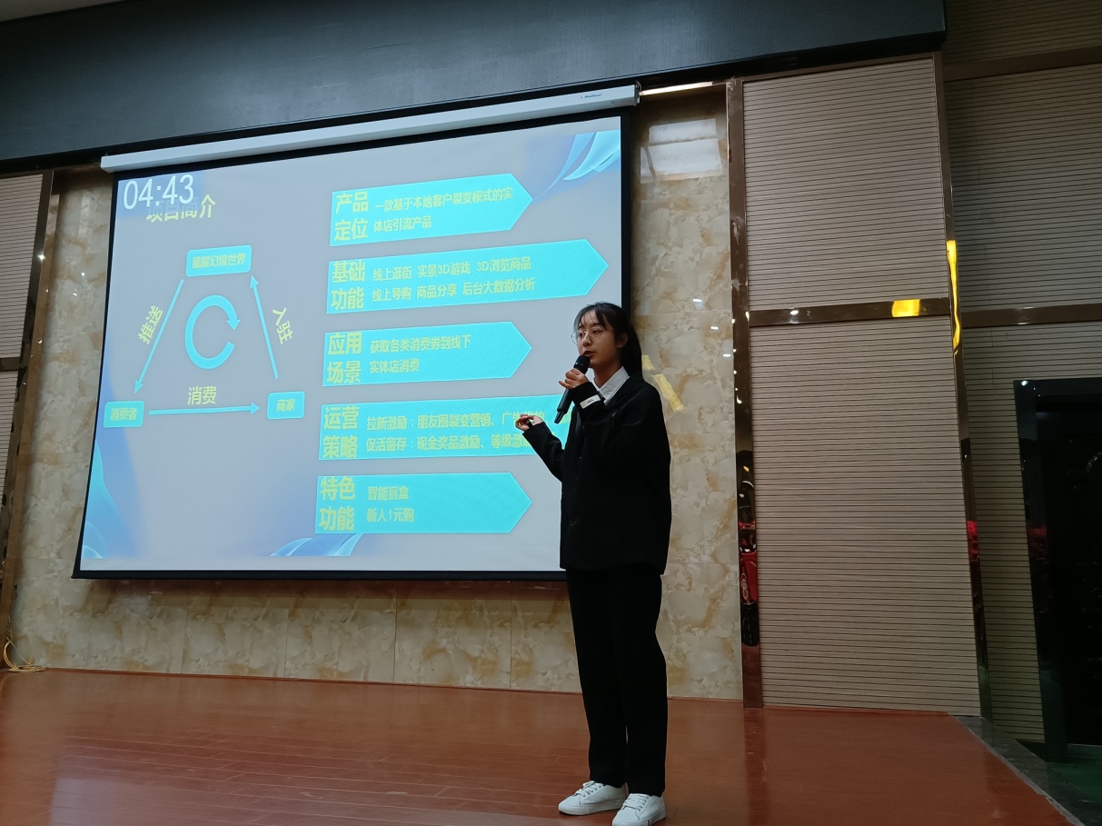 比赛分为项目PPT讲解及现场答辩两个环节。在PPT讲解环节中,每个团队负责人分别从背景分析,项目内容,团队介绍,社会效益等方面对项目进行介绍。在答辩环节,现场评委就其项目的实用性及创新能力,市场分析,营销策略,方案实现等方面进行了现场提问并做出点评。