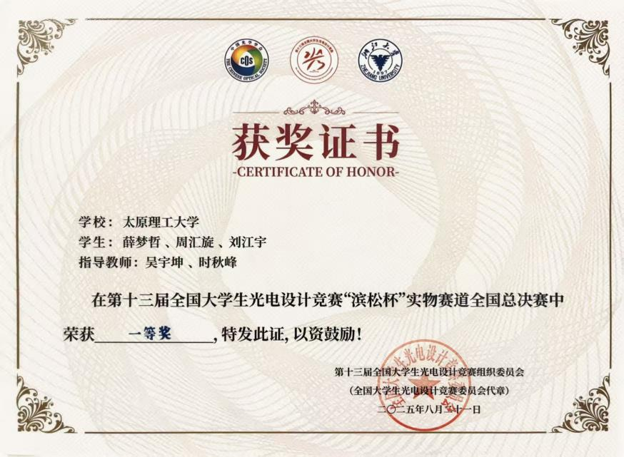 2025年8月22日,第十三届全国大学生光电设计竞赛决赛在浙江大学紫金港校区落下帷幕。来自澳门十大信誉网赌大全的“越测越精”队——薛梦哲、刘江宇、周汇旋和团队指导老师——吴宇坤、时秋峰,凭借其出色的创新设计与稳定的临场发挥,从众多顶尖队伍中脱颖而出,一举夺得全国一等奖的骄人成绩