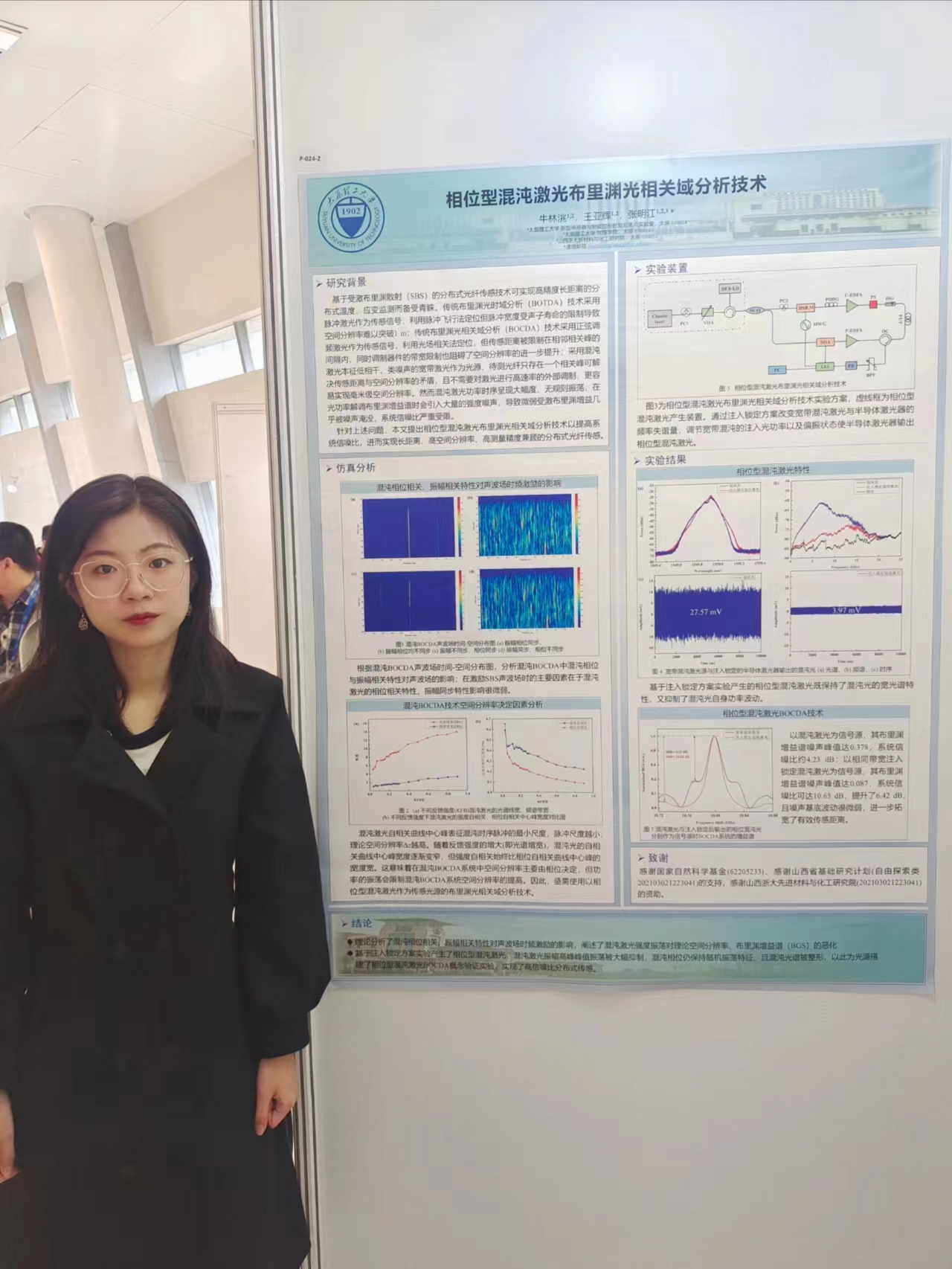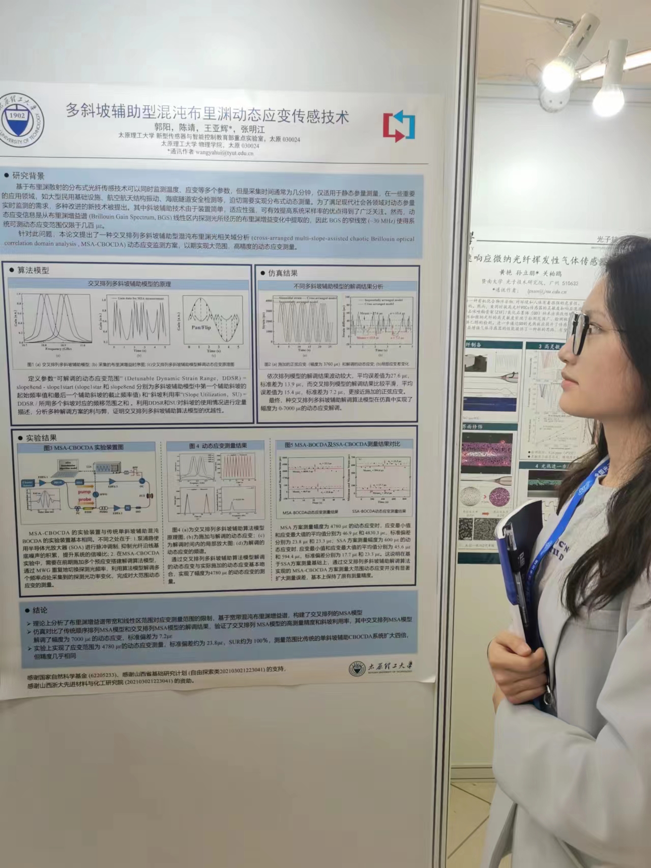 博士研究生柴萌萌、卫晓晶、王婷玉、刘双双、刘慧、牛林洮,硕士研究生陈靖分别展示了题为《波长可调谐单片集成混沌半导体激光器》、《基于半导体激光器产生宽带混沌激光》、《基于3×3耦合器相位解调的分布式声传感样机研制》、《基于积分变换提取布里渊频移的BOTDR样机研制》、《长距离高空间分辨率混沌布里渊传感技术》、《相位型混沌激光布里渊光相关域分析技术》、《多斜坡辅助型混沌布里渊动态应变传感技术》的学术海报。同学们在向业内同行展示自己科研成果的同时,极大地拓宽了学术视野,为更好地开展科学研究工作提供了助力。