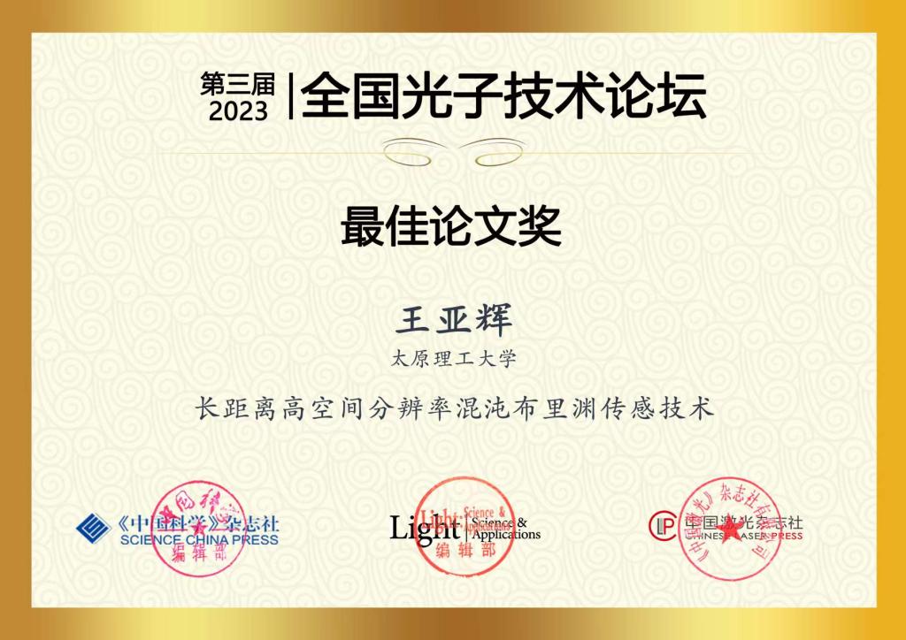 王亚辉博士的《长距离高空间分辨率混沌布里渊传感技术》获论坛最佳论文奖。该论文提出了一种采用优化时域门控方案联合差分去噪的混沌布里渊光学相关域分析技术,在27.54 km的传感距离上实现了2.69 cm的空间分辨率,有效传感点数超过100万,为重大设施结构健康监测提供了高性能的新方法。