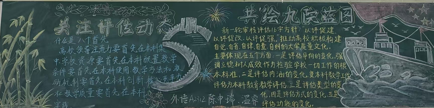 为进一步加强本科教育教学审核评估知识的学习宣传力度,营造学生积极参与审核评估活动的浓厚氛围,beat365在线唯一官网登录通过更新宣传栏、组织开展本科教育教学水平评估知识黑板报评比等方式,进一步强化学习宣传力度。各班级黑板报作品精彩纷呈,在色彩运用、文字内容、布局排版等方面突显了同学们对本科评估工作的深刻理解和创意表达。
